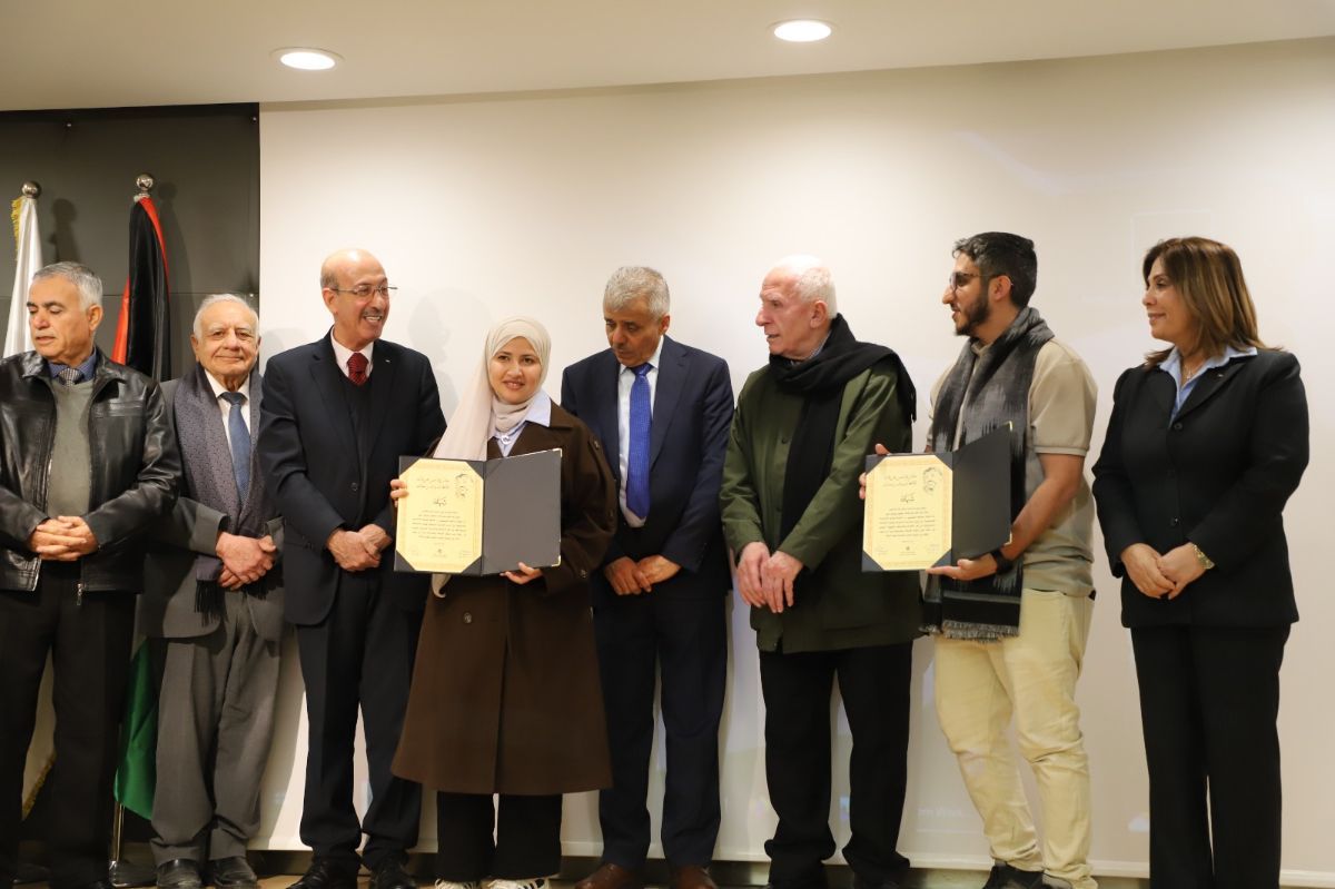 وتم تكريم الباحثين الفائزين بالمراتب الثلاث الأولى بشهادة الجائزة والقيمة المالية المحددة، وهم: الباحثة دانيا جبران الكحلة بالمرتبة الأولى وقيمتها (2500$) دولار من جامعة بير زيت، والباحث ليث عدنان النيص بالمرتبة الثانية وقيمتها (1500$) دولار من جامعة النجاح الوطنية، والباحثة نهى اسحاق الزعانين بالمرتبة الثالثة وقيمتها (1000$) دولار وهي باحثة من غزة تدرس في جامعة عين شمس في جمهورية مصر العربية.