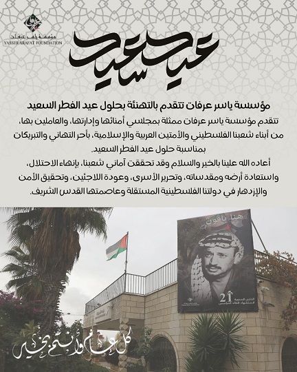 تتقدم مؤسسة ياسر عرفات ممثلة بمجلسي أمنائها وإدارتها، والعاملين بها، من أبناء شعبنا الفلسطيني والأمتين العربية والإسلامية، بأحر التهاني والتبريكات بمناسبة حلول عيد الفطر السعيد.