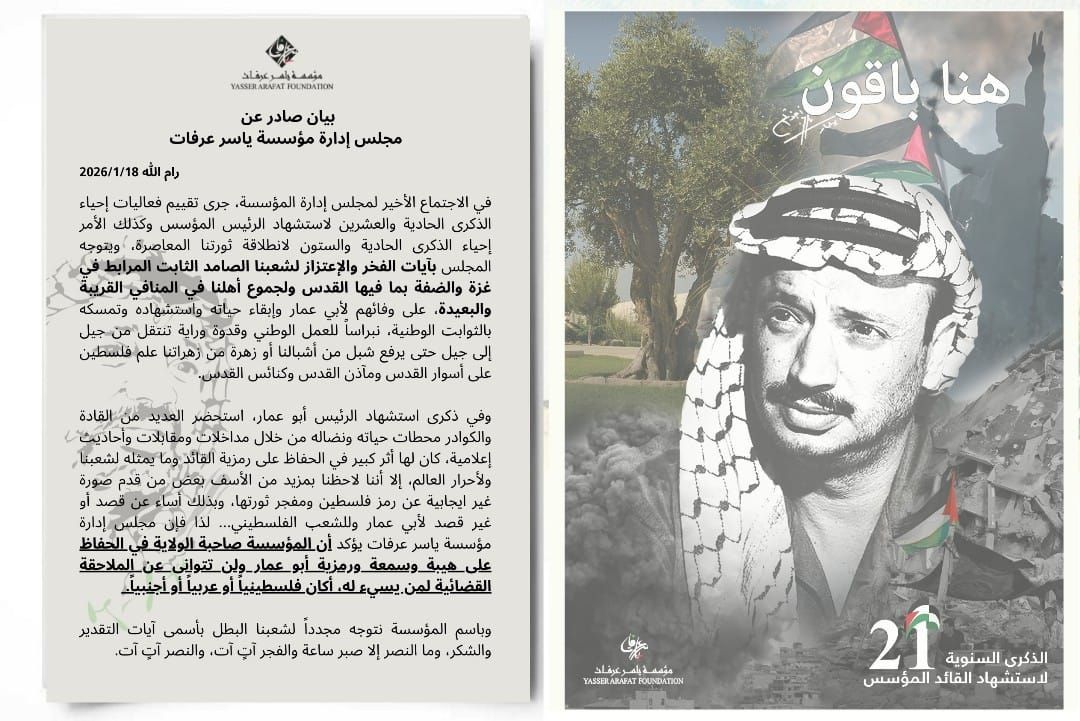 وفي ذكرى استشهاد الرئيس أبو عمار، استحضر العديد من القادة والكوادر محطات حياته ونضاله من خلال مداخلات ومقابلات وأحاديث إعلامية، كان لها أثر كبير في الحفاظ على رمزية القائد وما يمثله لشعبنا ولأحرار العالم، إلا أننا لاحظنا بمزيد من الأسف بعض من قدم صورة غير ايجابية عن رمز فلسطين ومفجر ثورتها، وبذلك أساء عن قصد أو غير قصد لأبي عمار وللشعب الفلسطيني... لذا فإن مجلس إدارة مؤسسة ياسر عرفات يؤكد أن المؤسسة صاحبة الولاية في الحفاظ على هيبة وسمعة ورمزية أبو عمار ولن تتوانى عن الملاحقة القضائية لمن يسيء له، أكان فلسطينياً أو عربياً أو أجنبياً.