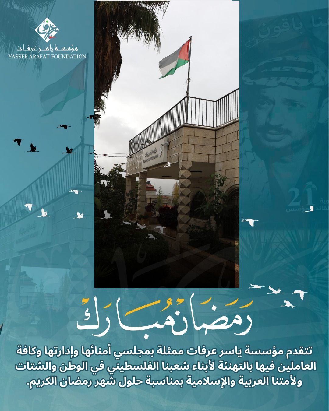 تتقدم مؤسسة ياسر عرفات ممثلة بمجلسي أمنائها وإدارتها وكافة العاملين فيها بالتهنئة لأبناء شعبنا الفلسطيني في الوطن والشتات بمناسبة حلول شهر رمضان المبارك.
